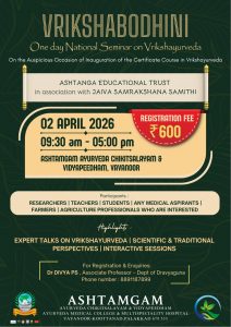 വൃക്ഷായൂർവ്വേദ കോഴ്സിൻ്റെ ഉദ്ഘാടനത്തോടനുബന്ധിച്ച് April 2 ന് അഷ്ടാംഗ എജുക്കേഷണൽ ട്രസ്റ്റ്, ജൈവ സംരക്ഷണ സമിതിയും ചേർന്ന് സംഘടിപ്പിക്കുന്ന “വൃക്ഷബോധിനി” നാഷണൽ സെമിനാറില്ലേക്ക് ഏവർക്കും സ്വാഗതം. എല്ലാവരുടെയും പങ്കാളിത്തവും സഹകരണവും പ്രതീക്ഷിക്കുന്നു.