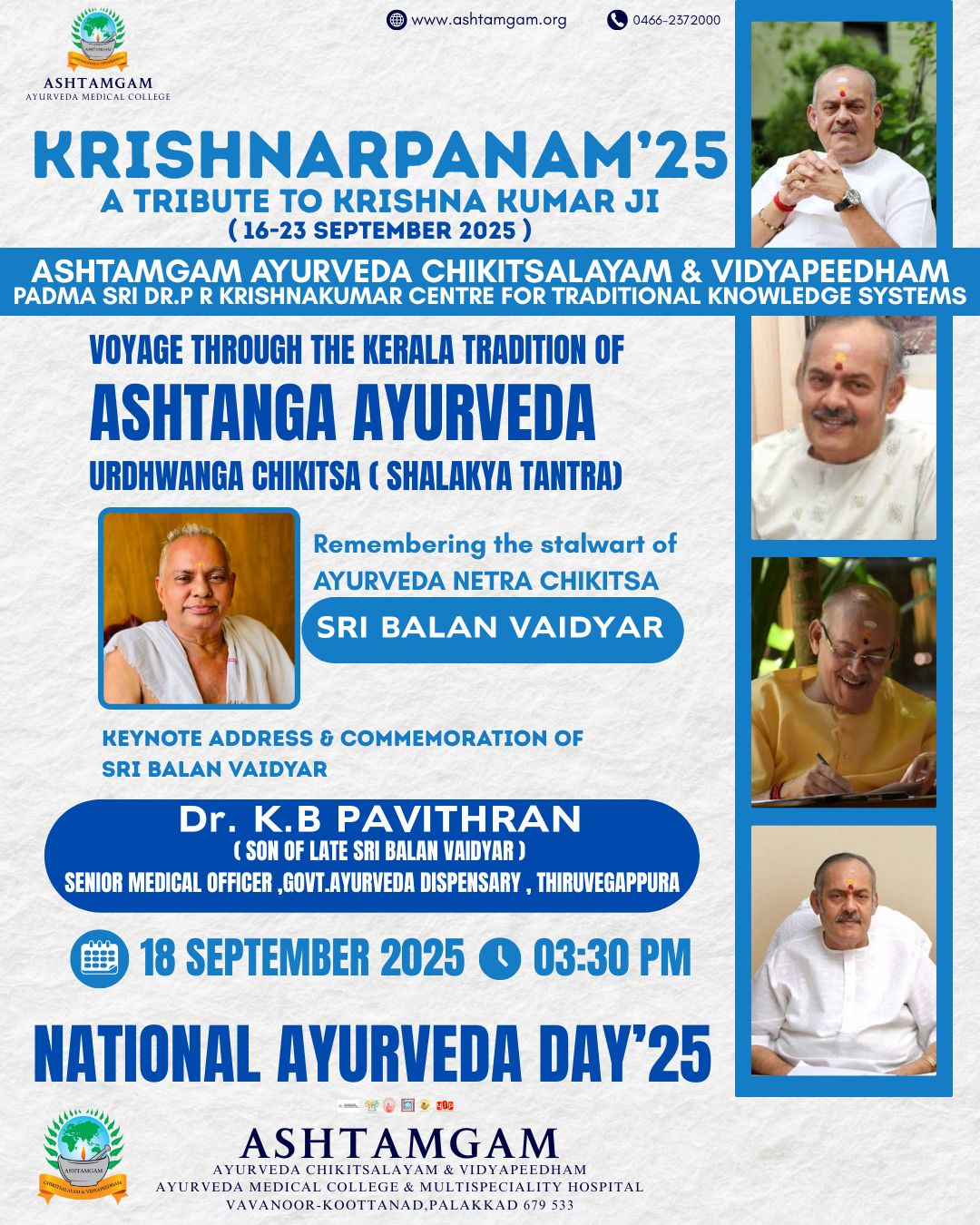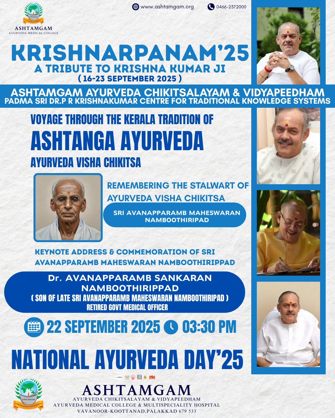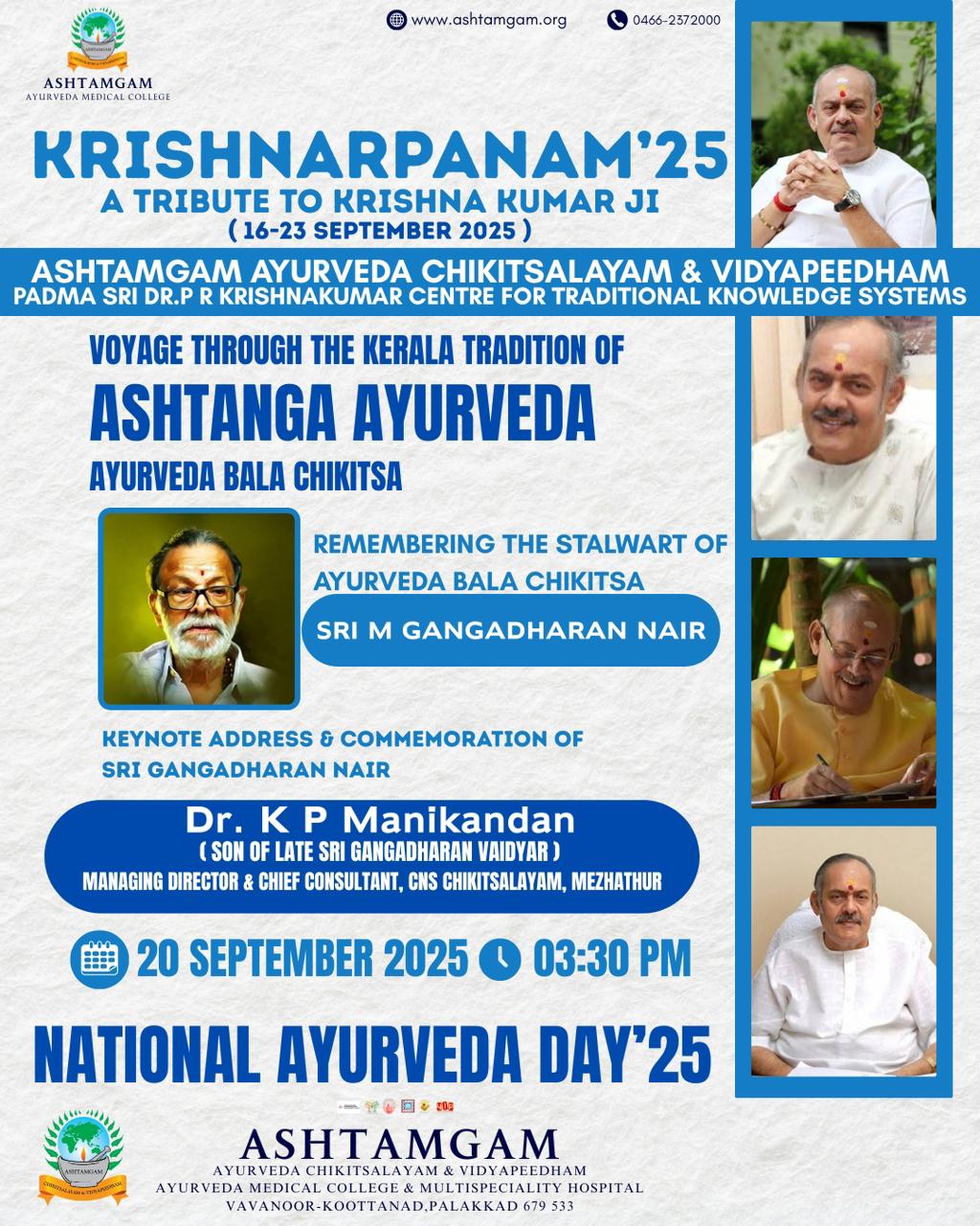 In Connection with National Ayurveda Day, We plan to Conduct Krishnaarpanam – A discussion series remembering the great Gurus under Krishnakumar ji Centre for Traditional Knowledge System. A program spread over 4 days…