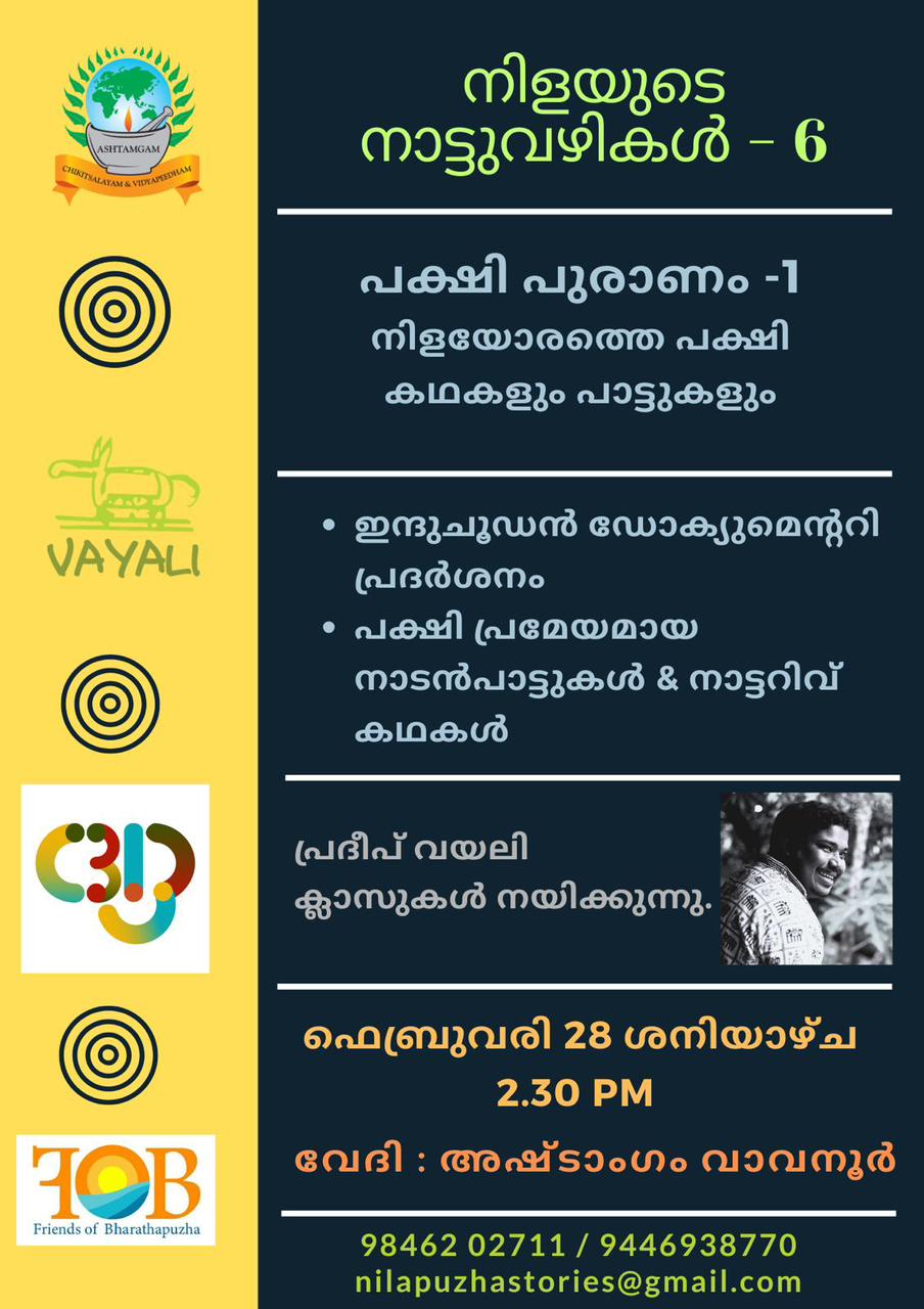 ഖനീ ഭൂതമായ ഒരു സംസ്കാരത്തിൻ്റെ ഈ തീരഭൂമിയിൽ , പുഴ മണ്ണിൽ ആകാശം നോക്കി ഒന്നു മലർന്നു കിടന്നാൽ ആ സർഗ്ഗചരിത്രമെല്ലാം നമുക്കു തെളിഞ്ഞു കിട്ടും . അത് നമ്മുടെ ഉള്ളുണർത്തും … നമ്മെ ഉയിർപ്പിക്കും … അതിനായി അഷ്ടാംഗം ആയുർവ്വേദ മെഡിക്കൽ കോളേജിൽ പ്രവർത്തിക്കുന്ന പത്മശ്രീ കൃഷ്ണകുമാർ സെൻ്റർ AVCRI കോയമ്പത്തൂർ, ആറങ്ങോട്ടുകര വയലി, ഫ്രൻ്റ്സ് ഓഫ് ഭാരതപ്പുഴ എന്നിവരുടെ സഹകരണത്തോടെ എല്ലാമാസവും നാലാമത്തെ ശനിയാഴ്ച ഉച്ചകഴിഞ്ഞ്2 മണി മുതൽ അഷ്ടാംഗം ആയുർവ്വേദ കോളേജിൽ വെച്ച് “നിളയുടെ നാട്ടു വഴികൾ” എന്ന പേരിൽ നിളാതട സംസ്കൃതിയുടെ വേരുകൾ തേടുന്ന ഒരന്വേഷണ പരമ്പരയ്ക്ക് ഒരുങ്ങുകയാണ് ….